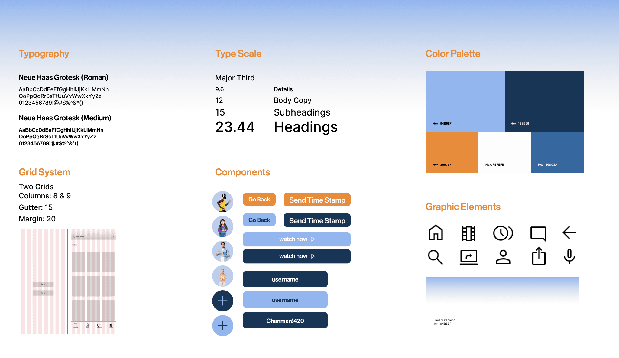 We chose this brand identity to keep a clean minimalistic feel that are consistent with other competitors. However, we added in a pop of orange as an accent color to provide more personality overall. Our icons are bold so the user can easily access the different pages and features.