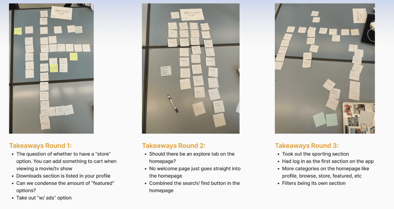 This helped us understand how to redesign the information architecture to flow more consistency and something the user better understands. We wrote out all of the actions and categories from the experience and had participants group them where they thought was best. We took note and applied it to the new information architecture design.