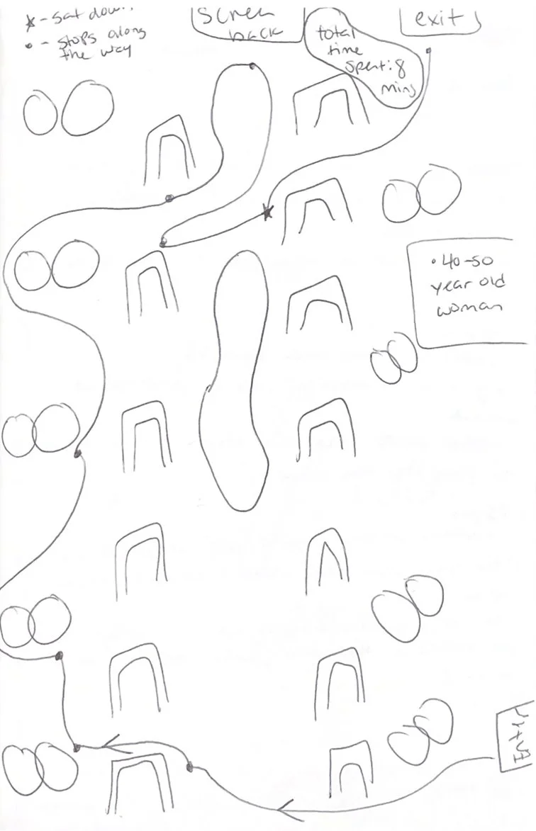 I observed 6 different people, of all ages, and how they interacted with the museum. I collected their behaviors, interactions, how long they were there for, if they stopped along the way, and sketched the route they took in the museum. I created a rainbow chart to synthesize my findings.