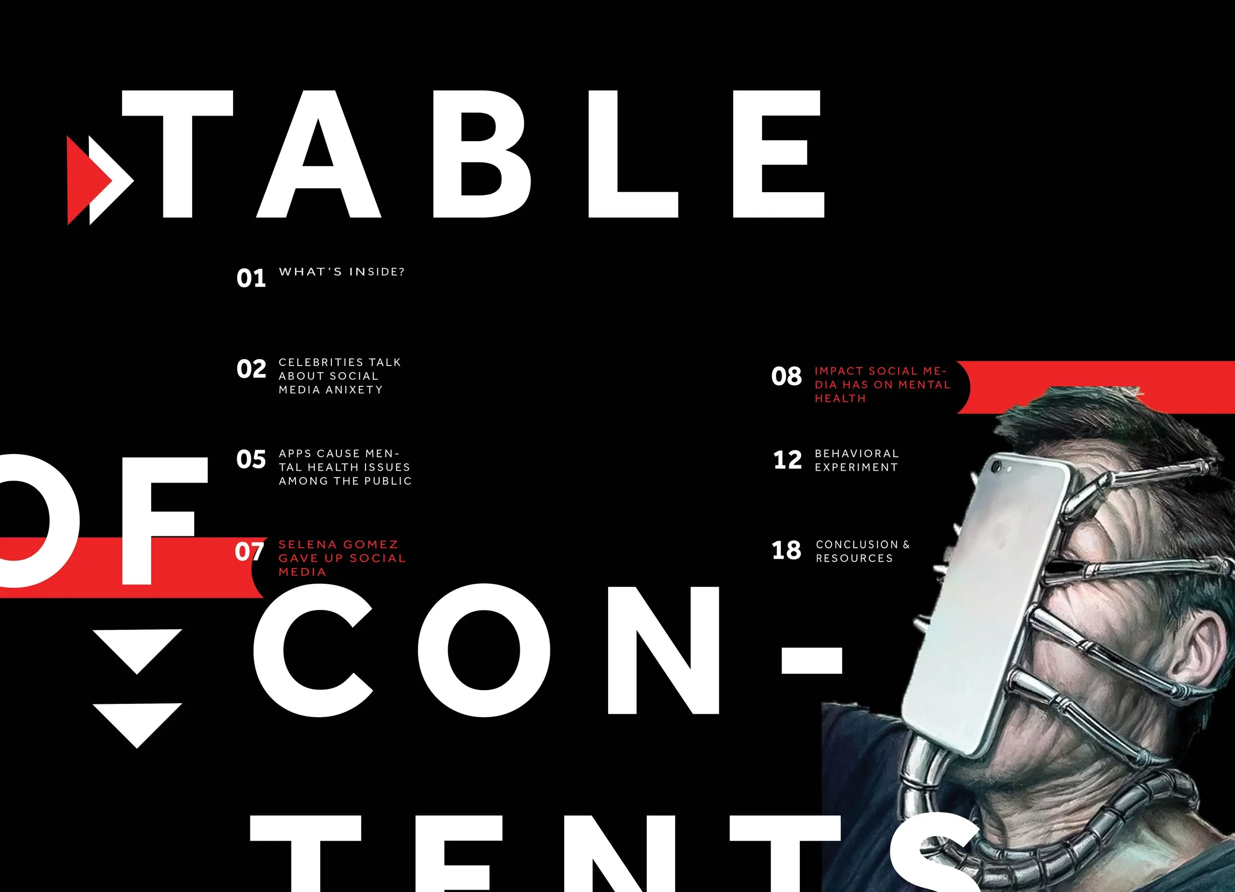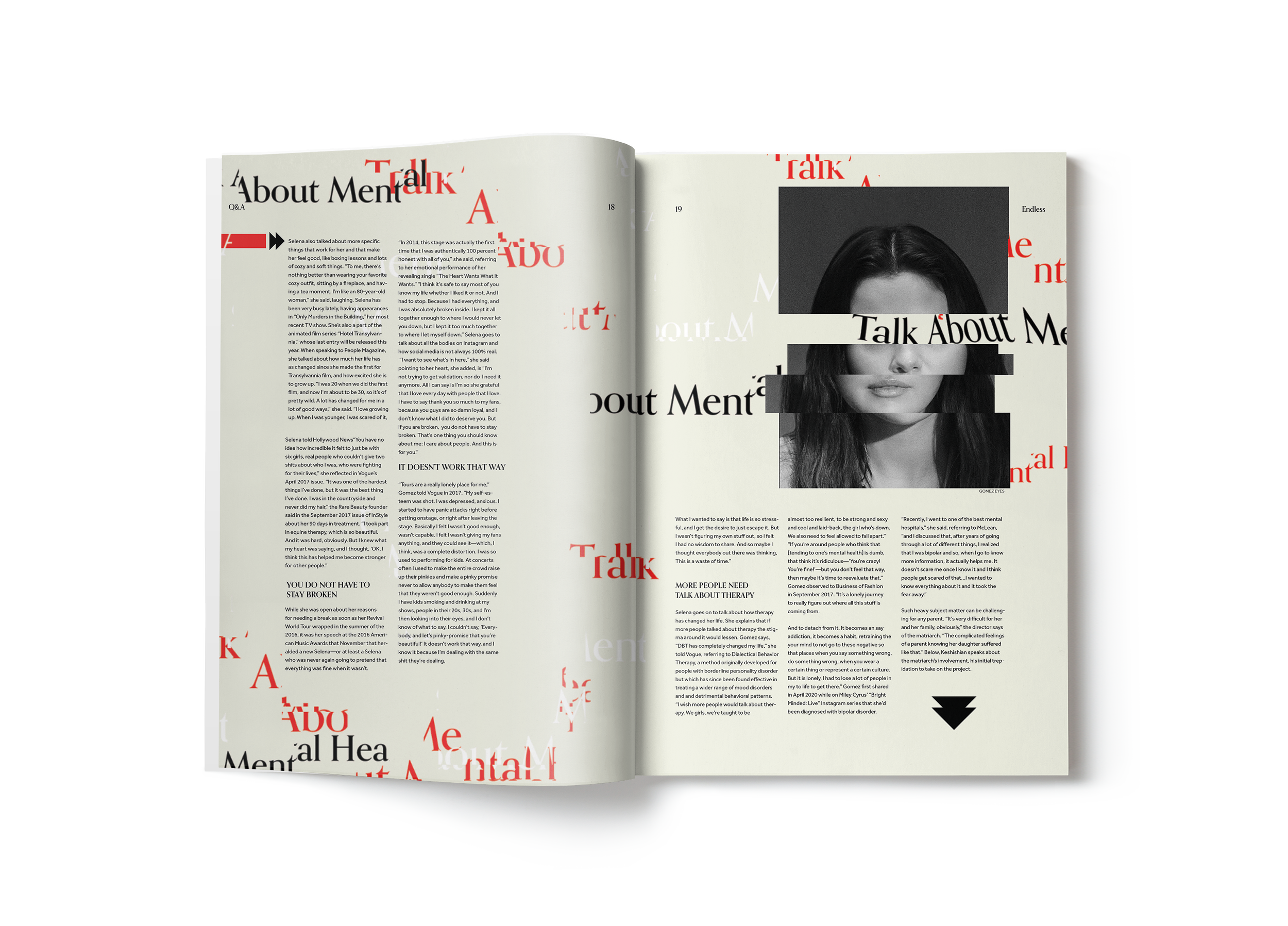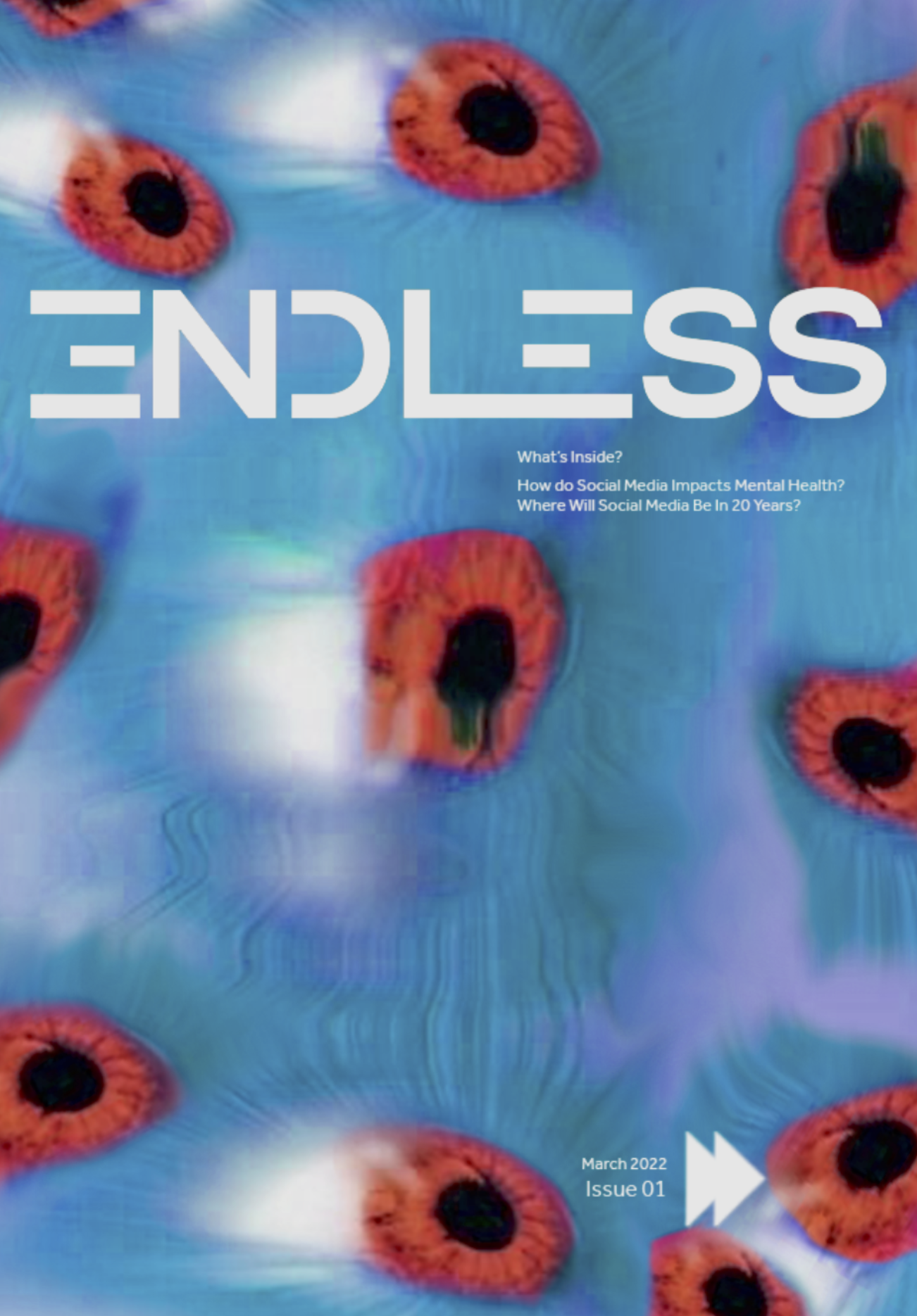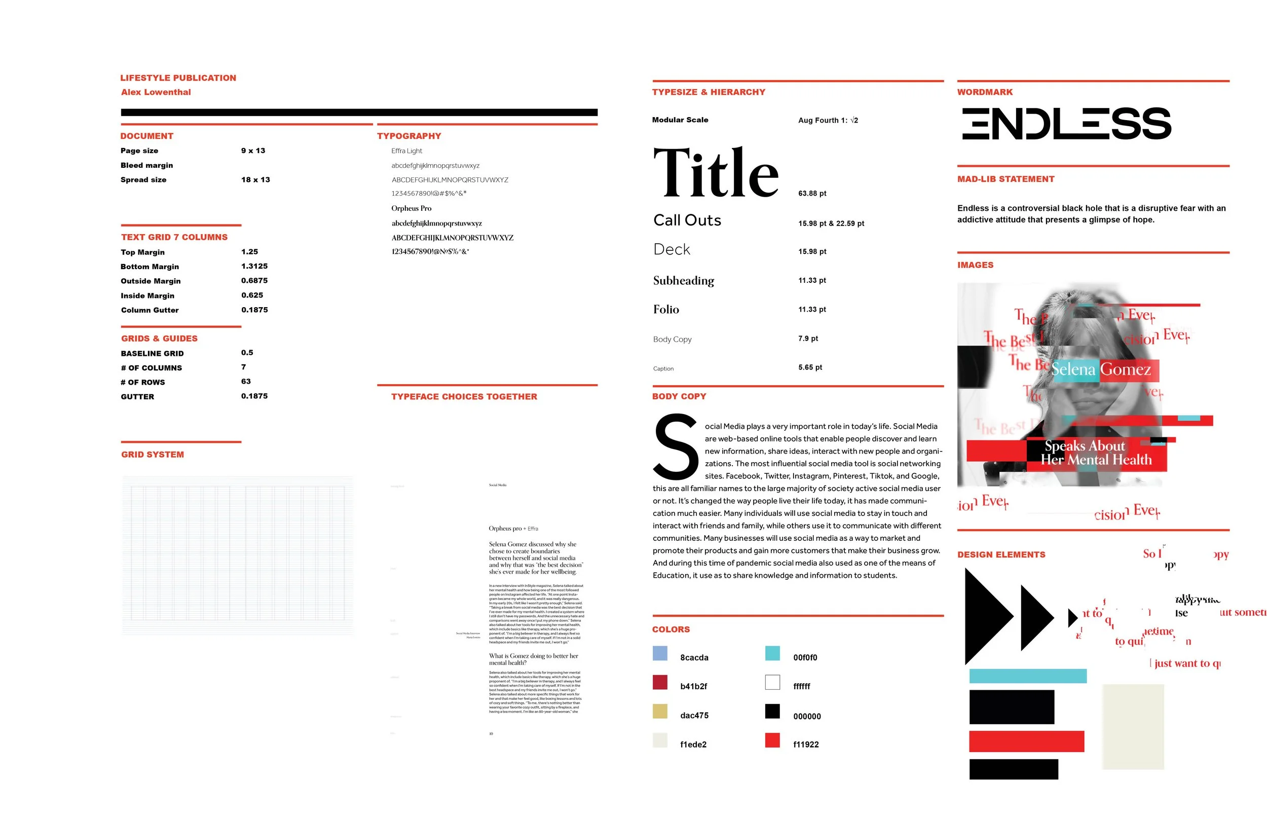 Create a fictional lifestyle magazine, design system, and explore typography through structure and begin to build a visual language. Build an identity, word mark, feel, and end with a developed magazine branding. Endless is a controversial black hole that is a disruptive fear with an addictive attitude that presents a glimpse of hope. Endless is a publication relating to the action of never ending scrolling social media.
